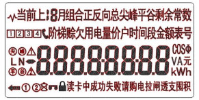 5、 運(yùn)行顯示:電表運(yùn)行過程中,輪流顯示表內(nèi)總平電量、峰谷電量、剩余電量、運(yùn)行時(shí)段。