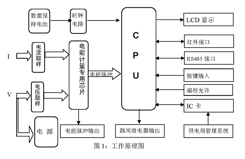 由計(jì)算機(jī)管理信息系統(tǒng),通過IC卡讀寫器,寫入一定電量和監(jiān)控要求的IC卡輸入表內(nèi)微處理器系統(tǒng),經(jīng)CPU運(yùn)算后,提供顯示、報(bào)警、切斷狀態(tài)信號(hào)。